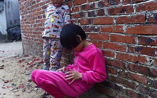 2月16日大年初一,广东湛江市徐闻县,一女孩蹲在墙角玩手游,一男孩旁观。东方IC 图
