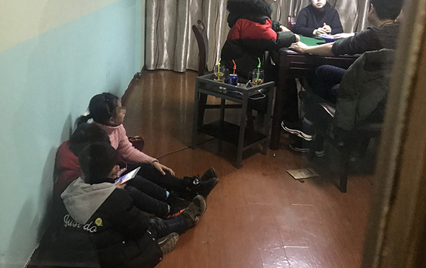 2月19日,湖南省桃江县,家长们在打麻将,一旁三个小孩坐在地上玩游戏。东方IC 图