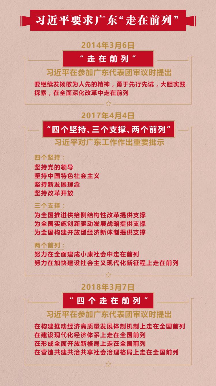 作为改革开放排头兵、先行地、实验区,广东走在前列,责无旁贷。观察习近平要求广东走在前列的这些领域,也都是在改革开放和社会主义现代化建设大局中的大命题。 ——在构建推动经济高质量发展体制机制上走在全国前列 在3月5日参加内蒙古代表团审议时,习近平就提出了经济高质量发展的命题,并对扎实推动经济高质量发展提出明确要求。在广东代表团,习近平重点谈到推动经济高质量发展的一个系统工程,那就是构建推动经济高质量发展体制机制。 ——在建设现代化经济体系上走在全国前列 十九大报告首次提出建设现代化经济体系。今年1月,中央政治局专门就建设现代化经济体系进行第三次集体学习。习近平在讲话时提出,国家强,经济体系必须强。 在3月7日上午的讲话中,习近平要求广东在建设现代化经济体系上走在全国前列,并对建设现代化经济体系提出了明确要求。 ——在形成全面开放新格局上走在全国前列 十九大报告对推动形成全面开放新格局做出决策部署,并将其列为建设现代化经济体系的重要内容。 在3月7日的讲话中,习近平谈到了党中央做出的一个重大决策——粤港澳大湾区建设。去年7月1日,习近平在香港见证了框架协议的签署。根据协议,粤港澳三地将打造国际一流湾区和世界级城市群。这是广东做好全面开放文章的重大机遇。 ——在营造共建共治共享社会治理格局上走在全国前列 十九大报告提出,要打造共建共治共享的社会治理格局。广东省委省政府提出,要努力把广东打造成为全国最安全稳定、最公平公正、法治环境最好的地区之一。