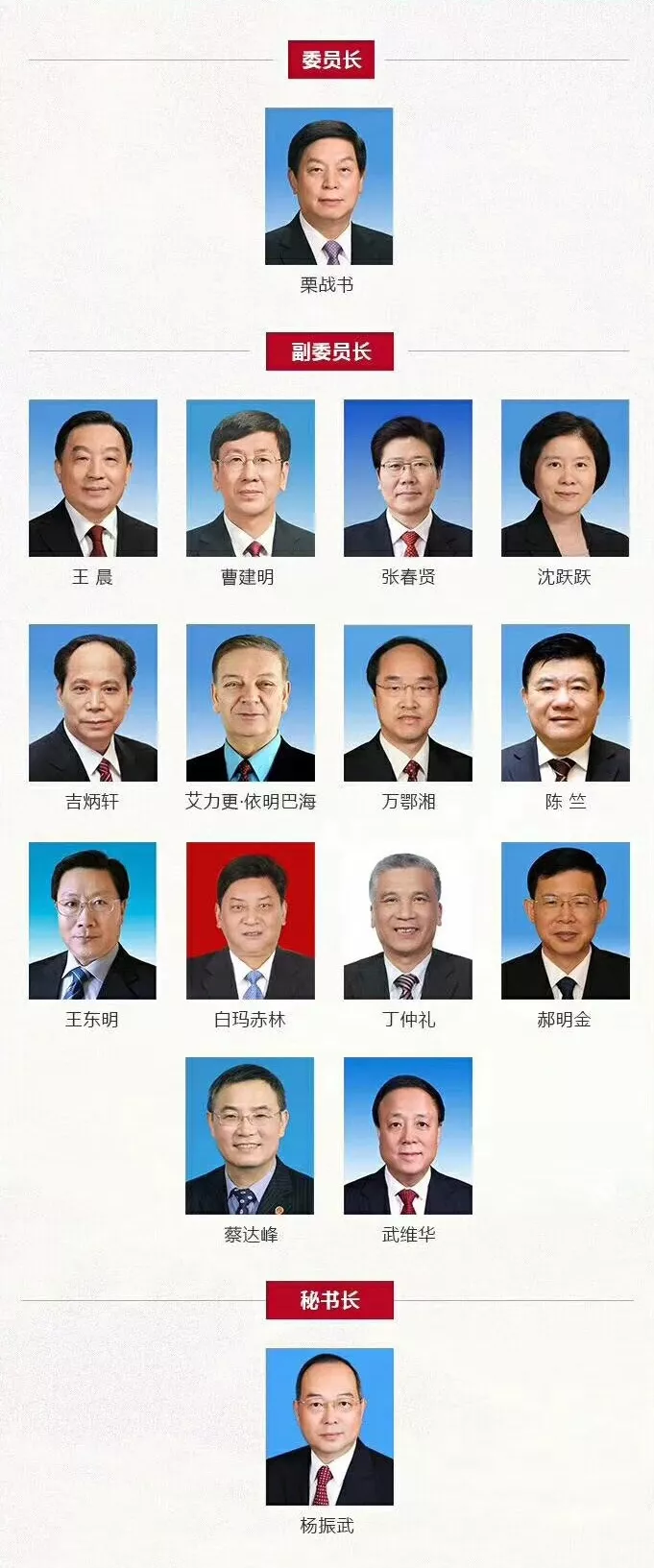 17日上午,十三届全国人大一次会议在人民大会堂举行第五次全体会议。栗战书当选十三届全国人大常委会委员长,王晨、曹建明、张春贤、沈跃跃、吉炳轩、艾力更·依明巴海、万鄂湘、陈竺、王东明、白玛赤林、丁仲礼、郝明金、蔡达峰、武维华当选副委员长,杨振武当选秘书长。 长安街知事发现,新一届全国人大常委会领导班子为16人,人数比上届多2人,其中有10位“新人”:委员长栗战书,副委员长曹建明、张春贤、王东明、白玛赤林、丁仲礼、郝明金、蔡达峰、武维华,秘书长杨振武。 栗战书,十九届中央政治局常委; 曹建明,十九届中央委员,最高人民检察院检察长、党组书记; 张春贤,十八届中央政治局委员,十九届中央委员,中央党的建设工作领导小组副组长; 王东明,十九届中央委员,四川省委书记; 白玛赤林,十二届全国人大民族委员会副主任委员、西藏自治区政府原主席、西藏自治区人大常委会原主任; 丁仲礼,民盟中央主席; 郝明金,民建中央主席; 蔡达峰,民进中央主席; 武维华,九三学社中央主席; 杨振武,十九届中央委员,人民日报社社长。 王晨、沈跃跃、吉炳轩、艾力更·依明巴海、万鄂湘、陈竺6位副委员长为上届继续连任。 此外,张德江卸任全国人大常委会委员长,李建国、王胜俊、陈昌智、严隽琪、张平、向巴平措、张宝文不再担任副委员长。 ![]() (责任编辑:日升) |