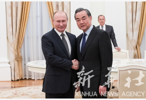 4月5日,俄罗斯总统普京在莫斯科克里姆林宫会见习近平主席特使、国务委员兼外交部长王毅。 新华社记者吴壮摄