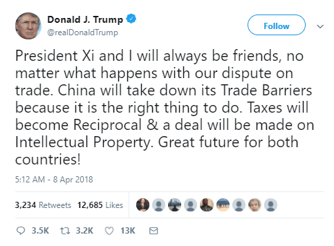 特朗普总统北京时间8日晚上在最新发出的推特中表示:“习近平主席和我将永远是朋友,无论我们的贸易争端如何。中国将取消贸易壁垒,因为这是正确的做法。税收将会变成互惠的,中美将会在知识产权上达成协议。两国都会有伟大未来!” 这条最新推特与特朗普之前推特在语气上有变化,对习主席和中国都表达了尊重。与此同时,他对中美贸易战的态度是含混的。他一边表达了对中国单方面“取消贸易壁垒”的期待,一边表示双方“将会在知识产权上达成协议”,似有主张双方各让一步的意思。而减少对华贸易逆差和要求中国“尊重美国知识产权”一直是华盛顿在这场贸易战中的两大要求。 就在两天以前,特朗普对中美贸易使用的是“我们不能让这种情况继续下去”的强硬措辞。 三位接受环球时报采访的中国重量级美国问题学者都表示,他们无法准确把握特朗普发这个推特究竟是什么意思,这是否代表了他态度的转变,或者他只想用这个推特安抚国内的不安情绪,缓解股市、期货市场的压力,以及舆论的不满。 值得注意的是,日前中方明确表示,中美近来经贸高官没有进行谈判,这一消息在美国投资界引起很大恐慌。几大金融指数都在下挫,共和党内批评特朗普的声音加重,农业和汽车等行业反对贸易战的声音进一步增加,这些动向都对白宫不利。 总的来看,华盛顿显然没有预料到中方对美国301项下对中国产品的征税计划有如此强烈反应,中方的不妥协让其不适。美国舆论一直对白宫一施压中方就会让步、特朗普总统的征税计划只是筹码抱有期待,并且白宫给公众的信息也是美中一直在谈判,而且有望达成协议。