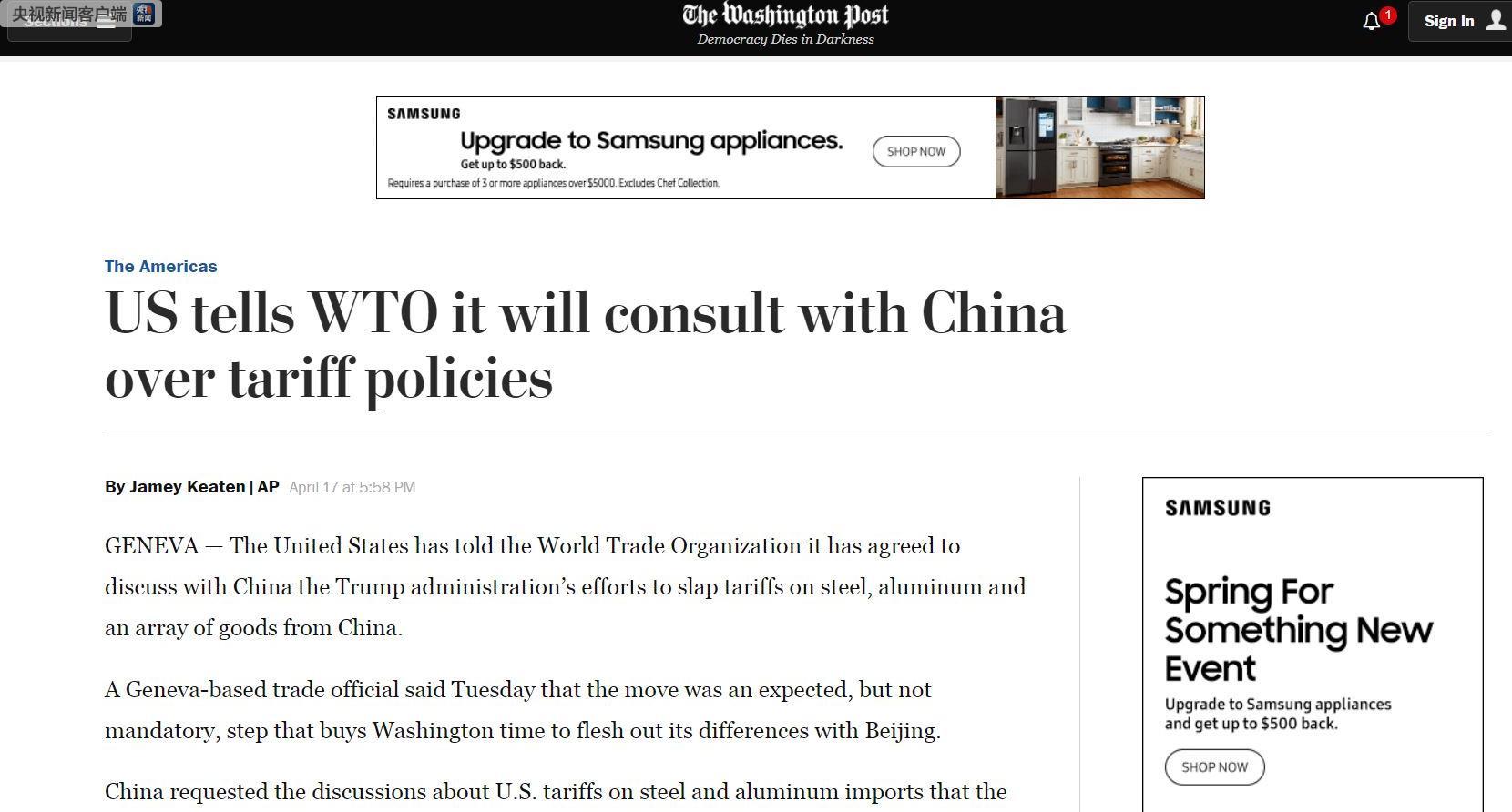 华盛顿邮报截图 据美联社、华盛顿邮报等美国媒体报道,美国已经告知世贸组织(WTO),特朗普政府同意就钢铝及一系列商品的关税问题与中国展开讨论。 本周二,一位在日内瓦WTO总部任职的贸易官员告诉记者,该举动属意料之中,但并非强制要求。他还表示,这为华盛顿赢得时间,可以理清与北京方面的具体分歧所在。该官员称,美国同意进行磋商,但没有放弃“加征关税是合理的”这一说法。因为未被授权公开这一消息,这名官员要求匿名。 美国4月17日向WTO提交了文件《美国对来自中国的某些商品的关税措施》,该文件中写道:“美国注意到《中华人民共和国商务部关于对源自美国的若干进口产品征收额外关税的公告》的2018年第34号公告。”据该公告,中国将“采取措施,对大豆及其他农产品、汽车、化工产品、飞机、和其他源自美国的产品征收额外关税,税率为25%, 涉及约500亿美元价值的2017年中国从美国进口的商品。”该文件表示,在磋商中,美国期待听到中国决定征收这些额外关税的理由。 在文件的最后一句,该文件表示:“我们随时准备同你的特派团官员在一个相互方便的日期就这些问题进行磋商。” 商务部发言人高峰12日曾明确表示,目前中美财经官员没有就贸易摩擦进行任何谈判。谈判是有原则的,而当时美方没有表现出任何谈判的诚意。