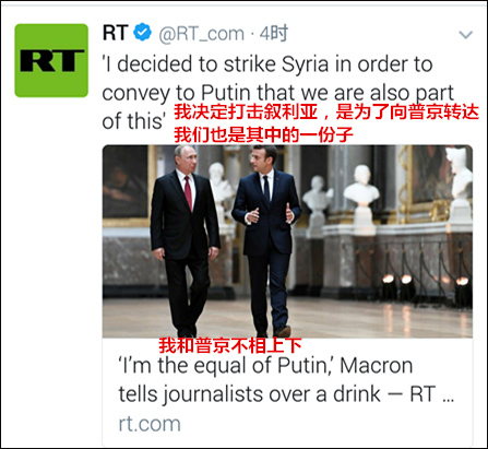 原标题:马克龙:攻打叙利亚是为证明我跟普京不相上下 据俄罗斯RT新闻17日报道,采访法国总统马克龙的记者曝出,马克龙认为自己和普京不相上下,打击叙利亚证明了这一点。 在上任一年之际,马克龙周日接受了RMC电台主持人布尔丹(Jean-Jacques Bourdin)和Mediapart网站的Edwy Plenel近三小时的采访。 采访节目在BFMTV播出后,马克龙和两位记者小酌了几杯。几杯酒之后,马克龙开始信口开河。 “我和普京不相上下”,布尔丹转述道,“顺便说一句,普京理解我。我决定打击叙利亚,是为了向普京转达我们也是其中的一份子”。 ![]()