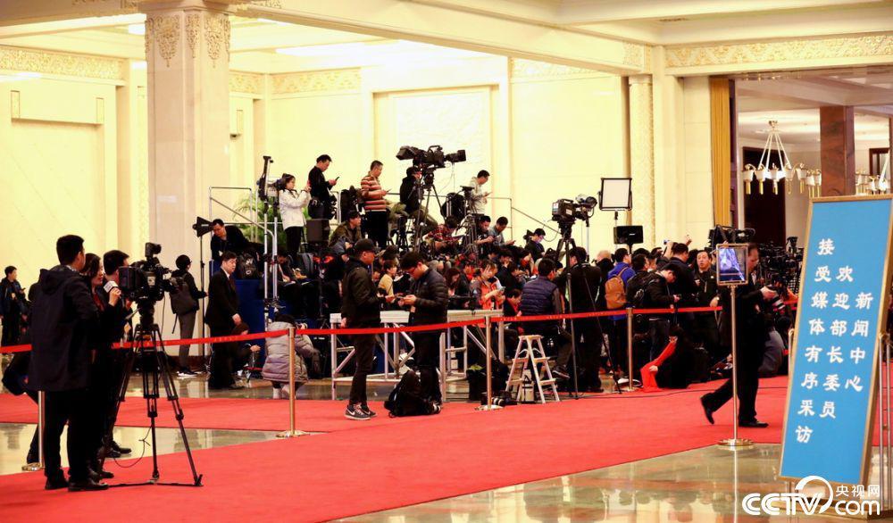 2018年部长通道”开启前,中外媒体记者提前就位“排兵布阵”。(图片来源:央视网)
