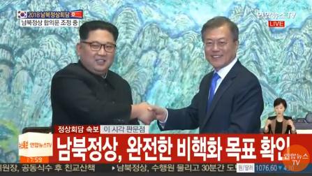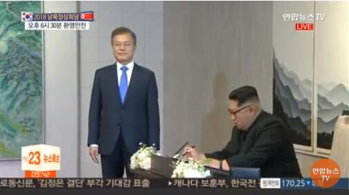 7.北京时间17时许,朝韩首脑共同签署《关于实现半岛和平、繁荣及统一的板门店宣言》(简称《板门店宣言》),朝韩一致确认了通过完全弃核实现半岛无核化的共同目标。随后,文在寅在共同记者会上表示,“我和金正恩委员长一起宣布,半岛再也不能生战,开启新的和平时代”。金正恩则表示,南北是不能分割的,希望可以共同开启和平新时代。
