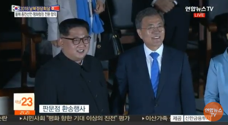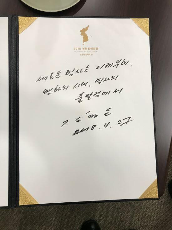 以后和朝鲜如果能通火车,那么朝韩两国就都可以有高速列车了,本来在6.15和10.4协议书中,有相关内容,可是过去了十年都没能实施,实在令人遗憾啊。金委员长的英明决策使得断绝了十年的血脉重新相连。 期待很大,也会有怀疑的看法,谈妥了总的协议可是十年都没能实施,今天我们的会谈结果能否得以实施,也有人持怀疑的看法。 虽然我今天走的距离很短,但是真的花了十一年的时间。我们十一年间没有做到的事情,通过一百多天坚持不懈的努力做到了。 这是坚定意志,携起手没有没有什么不能做到的事。 我本来在想,总统在这里和我见面,会不会觉得不方便,但还是通过特使在事前进行的沟通我就放心了。相互之间的信赖和信任是很重要的。