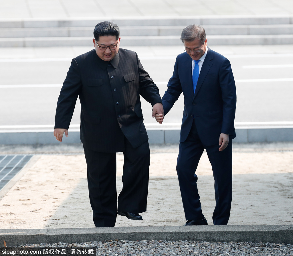 1.北京时间8时30分,朝鲜最高领导人金正恩与韩国总统文在寅握手并跨越军事分界线,随后两人“手牵手”跨越军事分界线进入朝方一侧,并在朝方一侧短暂停留。