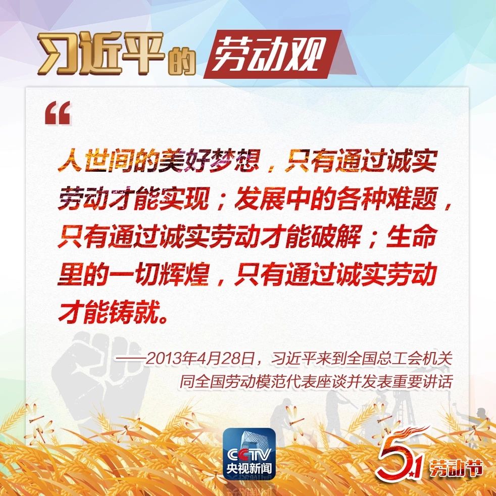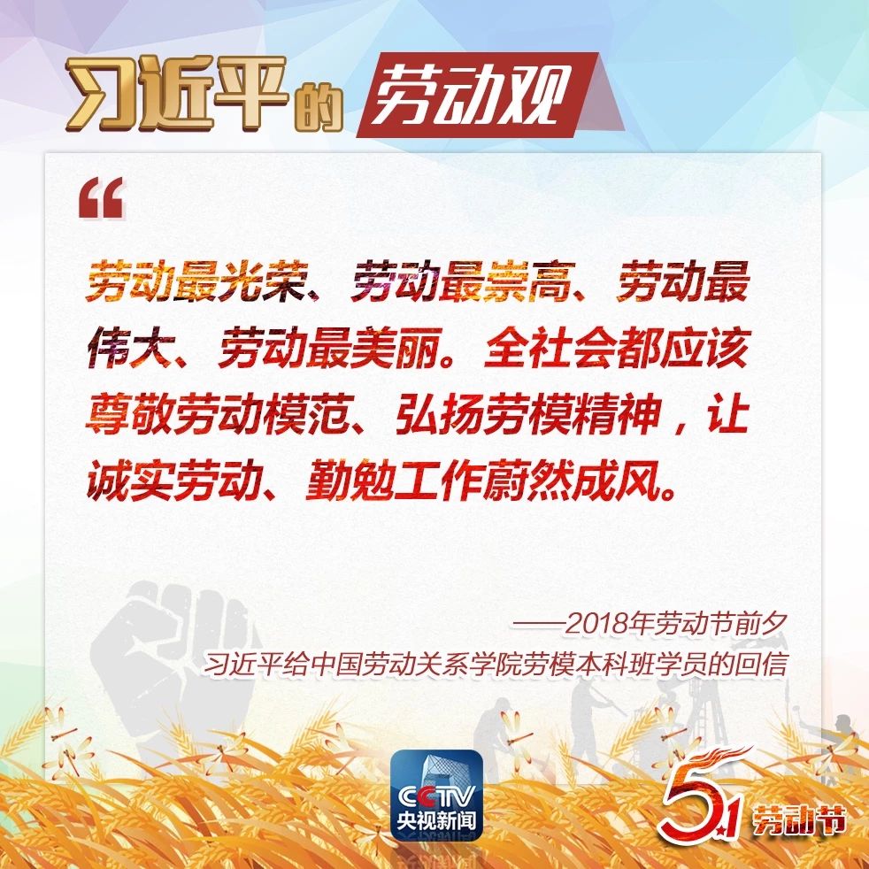 2018年4月30日 习近平:让诚实劳动、勤勉工作蔚然成风 在“五一”国际劳动节来临之际,中共中央总书记、国家主席、中央军委主席习近平给中国劳动关系学院劳模本科班学员回信,向他们并向全国所有劳动模范、向全国广大劳动者致以节日的问候。 习近平在回信中指出, 你们为党和国家事业发展作出了突出贡献,被评为劳动模范,如今又在读书深造,这是对大家辛勤劳动、无私奉献的褒奖,也是党和国家对劳动者的关怀。 习近平强调, 社会主义是干出来的,新时代也是干出来的。 希望你们珍惜荣誉、努力学习,在各自岗位上继续拼搏、再创佳绩,用你们的干劲、闯劲、钻劲鼓舞更多的人,激励广大劳动群众争做新时代的奋斗者。 习近平强调, 劳动最光荣、劳动最崇高、劳动最伟大、劳动最美丽。 全社会都应该尊敬劳动模范、弘扬劳模精神,让诚实劳动、勤勉工作蔚然成风。 习近平总书记一直尊重劳动、关心劳动者。党的十八大以来,他在多个场合、多次提及劳动和劳动者。明天就是“五一”劳动节,习近平关于劳动的论述,你还知道多少呢?一起读图↓