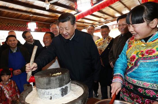 2018年2月,习近平在汶川县映秀镇同居民群众一起磨豆花。来源:新华网 今年春节前夕,习近平再次专程来到阿坝州汶川县映秀镇,这里是汶川特大地震震中地。10年过去了,映秀镇发生了翻天覆地的变化,一片祥和安宁。 在当地群众经营的制茶坊,习近平了解发展茶产业带动群众致富的情况。在村民开办的饭店,他询问生意怎么样,一家人的生活过得好不好。 看到百姓生活幸福安康,习近平表示:“我很牵挂这个地方,十年了,这里的变化我也很欣慰。”