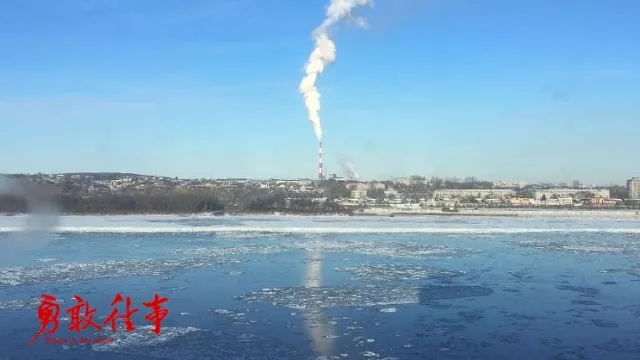 酒店窗外的黑龙江,对面是俄罗斯的发电厂