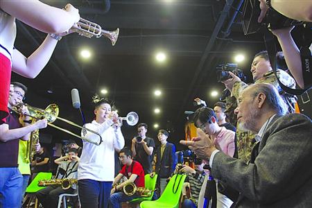 ▲看到孩子们这么开心,著名指挥家曹鹏也为他们打起节奏。5月24日下午5点,年逾九旬的指挥家曹鹏拄着拐杖来到咖啡馆,正赶上自闭症孩子们每周一次的“独奏”。