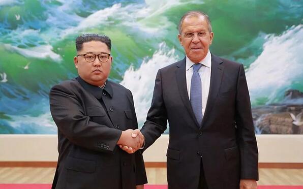 5月31日,朝鲜最高领导人金正恩(左)在平壤会见俄罗斯外长拉夫罗夫(朝中社)