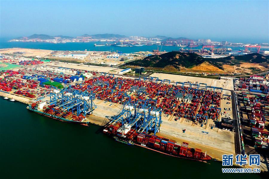 这是2018年5月4日航拍的青岛港前湾自动化集装箱码头。青岛港先后与俄罗斯圣彼得堡港等建立友好港关系。新华社记者李紫恒摄