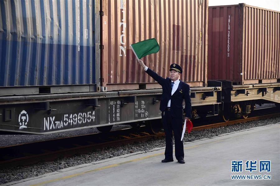 2018年5月7日,在青岛胶州湾国际物流园,中亚(青岛)国际班列在值班站长旗语指挥下缓缓开行。新华社记者 郭绪雷 摄