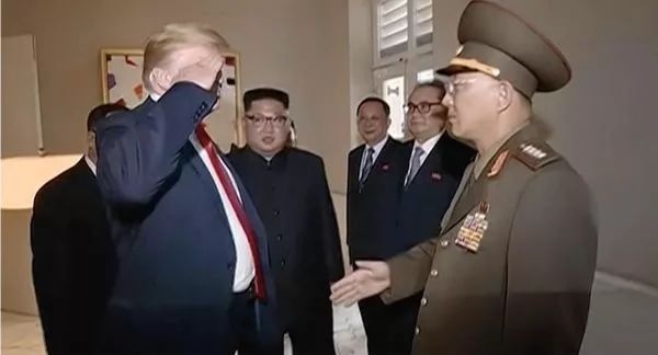 ▲朝鲜中央电视台的纪录片显示美国总统特朗普(左二)向一名朝鲜将军敬礼(美国政治网站) 另据美联社6月14日报道,朝鲜人对美国总统特朗普有了全新认识。他们看到他在新加坡举行的历史性峰会上与金正恩握手,甚至笨拙地向一位大将敬礼。这与2017年该国政府给他贴上的“老糊涂”标签截然不同。