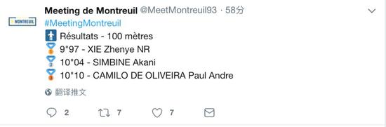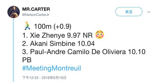 风速为+0.9米/秒 这一比赛名气不大,实则名将云集。男子100米比赛有南非纪录9.89秒的保持者希姆宾,以及法国本土名将、史上第一个百米破十的白人选手勒梅特等人。 谢震业被分在了第一道,抢走了冠军! 希姆宾摘银,成绩是10.04秒。 原黄种人最快纪录是日本名将桐生祥秀跑出的9.98秒(+1.8米/秒)。 中国最快纪录是苏炳添保持的9.99秒,他两次跑出这一佳绩,其中一次还逆风!