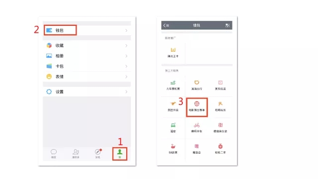 如下图所示,打开微信,按顺序点击 “我”—“钱包”—“电影演出赛事”,进入猫眼购票页面