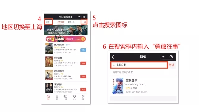 将地区切换到上海,点击搜索图标,随后输入“勇敢往事”进行搜索 3