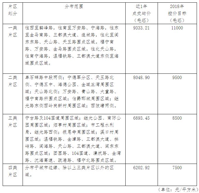 新房价格设“涨停板”的政策此前在其他城市也出台过,2016年3月18日,苏州发布《关于进一步促进苏州市房地产市场稳定健康发展的意见》,总计十条,其中有一条内容规定,“在对外销售时,申报价格3个月内不宜调高,6个月内调高幅度不宜超过6%,12个月内不宜超过12%。下一批次备案预售价格不宜高于上一批次同类型房屋成交均价的6%。” 也就是说,开发商在一年之内楼盘的涨幅最多只能涨12%。不过没有宁德此次规定详细,且也是用的“不宜超过”字样。 1 要点1:新房价格每年涨幅6%以内 意见明确,中心城区新建商品住房均价在2018年1月份水平(8882元/平方米)的基础上,每年涨幅控制在6%以内,普通高层住宅(毛坯)预售均价实行最高限价,最高控制在11000元/平方米以内。 记者注意到,划分4个调控片区,其中,一类片区今年调控目标价最高,为11000元/平;四类片区今年调控目标价最低,为7500元/平。