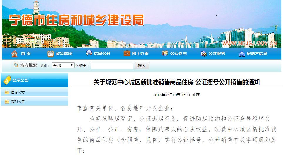 宁德市住房和城乡建设局表示,年涨幅控制在6%以内,2018年下半年涨幅控制在3%以内,参考了中心城区居民消费价格指数(CPI)、银行贷款利率和居民人均可支配收入增幅等因素。 2 要点2:公证公开摇号销售 此次,宁德楼市新政的还有一大亮点是,将摇号纳入了调控手段。此前已经有成都、西安等多个城市实行了摇号销售的政策。 意见规定,对中心城区新批预售的商品住房项目实行公证摇号、公开销售,其中应安排50%的套数优先考虑蕉城、东侨户籍无房户首次购房等刚性需求。房地产开发企业取得预售许可后,应组织公证摇号公开销售商品住房,摇号排序、按序购房,摇号排序名单应现场公示,选房后不得更名转让。 同时,出台了公证摇号公开销售的相关通知,规定了具体的摇号、选号等规则。