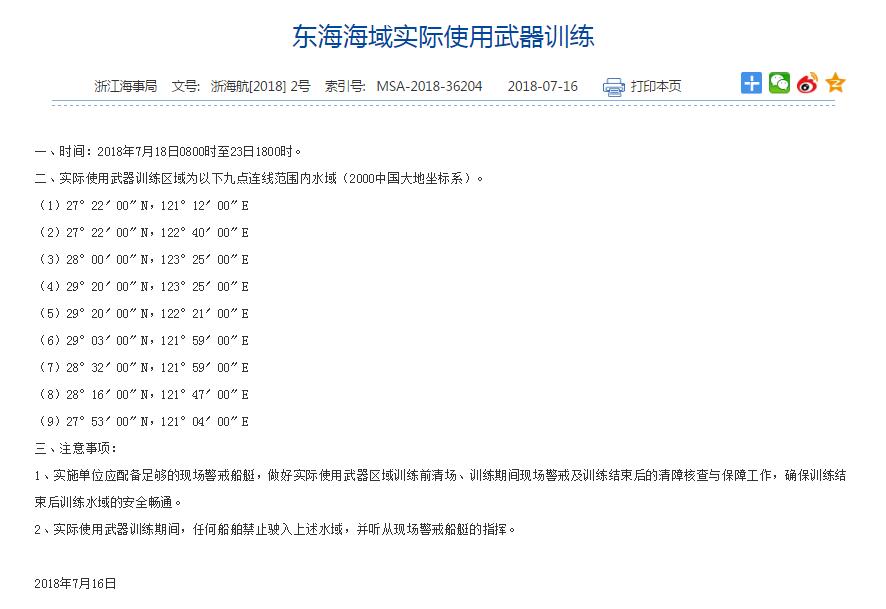 浙江海事局官网截图 据浙江海事局发布的“航行警告”,解放军18日起将在东海海域进行为期6天的大规模实弹演习。有军事专家17日对《环球时报》表示,这是针对“台独”分裂分子“量身定制”的一次演习。在台湾岛内,此次演习也引发关注。台湾军方17日“安慰”称,共军这次属于例行性演训,不用随之起舞。 浙江海事局16日发布公告称:根据部队年度例行性训练计划安排,定于2018年7月18日上午8点至7月23日下午6点,在象山至温州以东海域组织实际使用武器训练。根据公告中提及的信息,此次演习海域北到舟山南至温州以南广阔的海域。就禁航区而言,这是解放军传统的演练海域,几乎每年都会在相近海域进行演习。 一位要求匿名的专业人士17日对《环球时报》表示,从所公布信息分析,此次演习持续时间长、演习区域大、参加兵力多、实际使用武器多,表明这是一场级别、规模都比较高的演习。该人士表示,根据此前公开报道,海上演习一般分为舰队、海军、军委等不同层级牵头组织,层级越高,可调动参与的军种越多,会包括海、陆、空、火箭军以及战略支援部队参加。而在海军牵头组织的背景下,一般而言三大舰队皆有兵力参加,其中涉及水面、水下、空中等多兵种,代表海军现代化力量的新型舰艇、潜艇、空中力量将悉数参加。 军事专家宋忠平17日对《环球时报》记者表示,从时间跨度和禁航区来分析,此次规模应该是一种战役级别和若干战术级别相结合的演练,即在战役级别的演练中会有若干战术级别的演练来配套。 此外,浙江海事局航行警告的注意事项提及:“实施单位应配备足够的现场警戒船艇,做好实际使用武器区域训练前清场、训练期间现场警戒及训练结束后的清障核查与保障工作,确保训练结束后训练水域的安全畅通。” 上述专业人士认为,从此前的演习及近些年军委对实战化演习的要求可以推断,演习中实际使用武器的数量越来越多,越来越全面,型号越来越丰富,包括潜对舰、舰对舰、舰对空、空对舰、空对空等各种导弹。据该人士介绍,此次演习是要检验体系作战能力、战法训法、武器装备效能,也就是要检验过去一年来海军最新的训练成果。