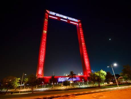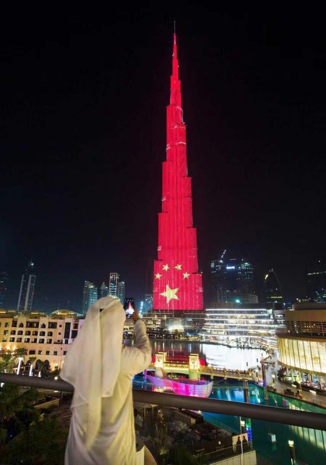 哈利法塔(推特图) 7月19日下午,习近平乘专机抵达阿布扎比总统机场,开始对阿拉伯联合酋长国进行国事访问。 为了欢迎中国最高领导人时隔29年再次到访,阿联酋将7月17日至24日定为“阿联酋中国周”,并用“中国红”点亮当地地标建筑。 世界第一高楼哈利法塔(迪拜塔)在当地时间17日凌晨化为一面巨幅五星红旗。 当地主流媒体《国民报》网站(thenational.ae)18日报道,在阿联酋准备欢迎中国国家主席之际,红黄色调点亮了迪拜哈利法塔。 一些当地著名地标正加紧测试LED灯光系统,阿布扎比国家石油公司总部大楼(ADNOC Headquarters) 和哈达利亚特大桥(Hudayriat Bridge)也已穿起红装。