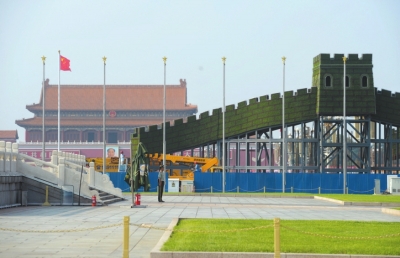 图片说明:天安门广场正在搭建“长城”。京华时报记者 谭青 摄
