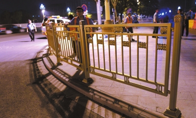 图片说明:昨天凌晨,施工人员在更换长安街人行道护栏。京华时报记者 范继文 摄