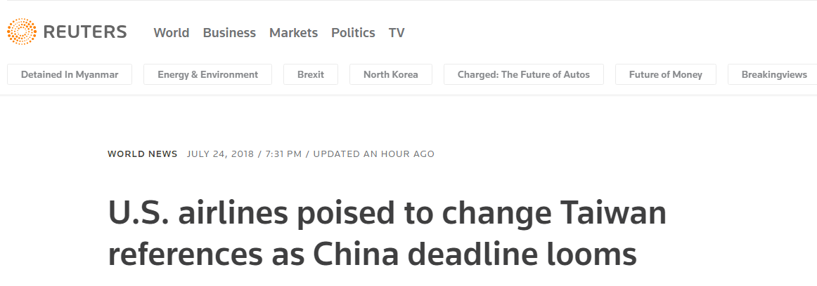 路透社报道截图 7月25日是中国民航局要求外国航空公司更改涉台错误标注的最后期限,截至24日未作出更改的美国几家航空公司预计将在周三(25日)前更改相关信息。路透社24日援引消息人士的话报道称,在与美国政府协调后,美国主要的航空公司将修改其网站相关信息,以目的地城市名称作为标注。 据报道,一位美籍航空的高管就该问题对路透社说,美国国务院周一(23日)晚间通知中国驻华盛顿大使馆,美国的航空公司决定在中英文网站上以目的地城市名称作为标注,而不以管辖权所属“台湾”作为标注。路透社称,另一位在北京的消息人士说,美国政府非正式地告知他,航空公司未来只使用城市名称作为标注。