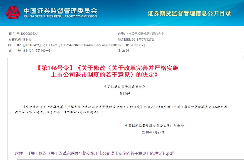 而如今证监会发布了《关于修改<关于改革完善并严格实施上市公司退市制度的若干意见>的决定》,是否退市、何时退市想必很快会有答案。而基金会不会继续下调公司估值,同样值得关注。 附:证监会修改意见全文 近日,证监会发布了《关于修改<关于改革完善并严格实施上市公司退市制度的若干意见>的决定》,对2014年《关于改革完善并严格实施上市公司退市制度的若干意见》(以下简称《退市意见》)进行修改。 上市公司退市制度是资本市场的重要基础性制度,2014年《退市意见》发布以来,已初步形成包括重大违法强制退市在内的多元化退市指标体系以及较为稳定的退市实施机制,对于进一步健全完善资本市场基础功能,实现上市公司退市的市场化、法治化和常态化具有重要意义。证监会在总结《退市意见》实施以来经验的基础上,贯彻落实《证券法》的规定,进一步完善重大违法强制退市的内容,提高规则的可操作性,强化证券交易所的一线监管职能,对《退市意见》进行了修改。