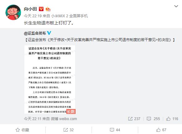 先是被国家多部门介入调查,而后董监高、大股东被限售,股票被ST处理……深陷舆论漩涡的长生生物,在7月27日这个晚上,又收到两个大消息。 证监会修改退市制度 长生生物大概率要凉 第一个大消息来自证监会。 27日晚上10点左右,证监会通过官网发布了《关于修改<关于改革完善并严格实施上市公司退市制度的若干意见>的决定》。从内容上看,这次修改的部分规定堪称为长生生物“量身定做”。