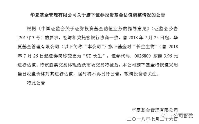 事件发生后,不少基金下调了ST长生的估值,7月16日,安信基金公告下调ST长生估值至16.11元/股;7月17日,九泰基金将ST长生的估值价格下调至14.5元/股;7月20日,泰达宏利基金对ST长生按照10.57元/股进行估值。 下调幅度最大的是华夏基金,公告自7月25日起,对ST长生按照3.96元进行估值,约还有19个跌停。
