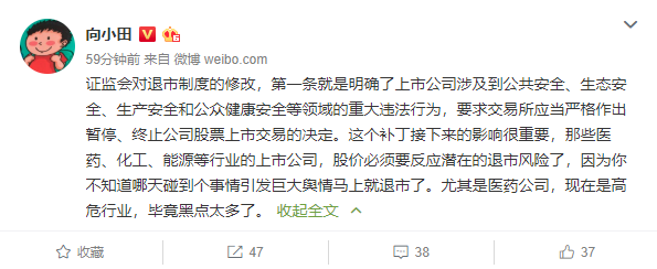 修改主要包括三个方面: 一是完善重大违法强制退市的主要情形,明确上市公司构成欺诈发行、重大信息披露违法或者其他涉及国家安全、公共安全、生态安全、生产安全和公众健康安全等领域的重大违法行为的,证券交易所应当严格依法作出暂停、终止公司股票上市交易的决定的基本制度要求。 二是强化证券交易所的退市制度实施主体责任,明确证券交易所应当制定上市公司因重大违法行为暂停上市、终止上市实施规则。 三是落实因重大违法强制退市公司控股股东、实际控制人、董事、监事、高级管理人员等主体的相关责任,强调其应当配合有关方面做好退市相关工作、履行相关职责的要求。 最高层批示、国家多部门介入调查、公司停产、责任人被刑事拘留、股票跌停板数量不断刷新,此前就有不少关注案情者在猜测:长生生物距离退市有多远? 毫无疑问的是,证监会此次修改2014年上市公司退市制度若干意见,就是给正处在风口浪尖上的ST长生拉响退市警报。不少网友分析称,退市“板上钉钉”了。