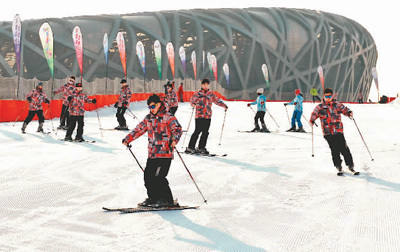 滑雪教练在鸟巢欢乐冰雪季冬奥项目体验区展示滑雪技巧。