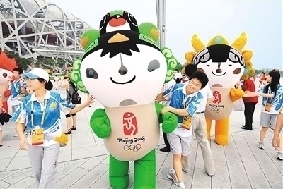 2008年8月8日,志愿者和游客在“鸟巢”旁与北京奥运会吉祥物“福娃”合影留念。