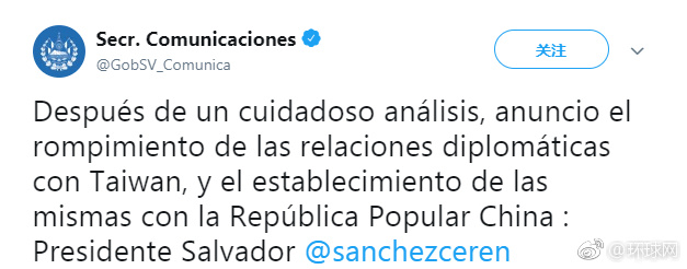 又少一个!萨尔瓦多与台湾“断交”![]() 】据台湾“外交部”今天发布会上的消息,位于中美洲的萨尔瓦多宣布与台湾“断交”,这是蔡英文时期第五个宣布与台“断交”的国家,目前台湾“友邦”降至17个。 其中:①拉丁美洲9个:危地马拉、洪都拉斯、尼加拉瓜、伯利兹、海地、圣卢西亚、圣文森特和格林纳丁斯、圣基茨和尼维斯、巴拉圭;②大洋洲6个:所罗门群岛、基里巴斯、马绍尔群岛、 帕劳、 瑙鲁、图瓦卢;③非洲1个:斯威士兰;④欧洲1个:梵蒂冈。此前“断交”的4国包括:圣多美普林西比、巴拿马、多米尼加、布基纳法索。