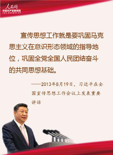 1、“两个巩固” 宣传思想工作就是要巩固马克思主义在意识形态领域的指导地位,巩固全党全国人民团结奋斗的共同思想基础。 ——2013年8月19日,在全国宣传思想工作会议上发表重要讲话 2、做到因势而谋、应势而动、顺势而为 宣传思想工作一定要把围绕中心、服务大局作为基本职责,胸怀大局、把握大势、着眼大事,找准工作切入点和着力点,做到因势而谋、应势而动、顺势而为。 ——2013年8月19日,在全国宣传思想工作会议上发表重要讲话 3、意识形态工作是党的一项极端重要的工作 经济建设是党的中心工作,意识形态工作是党的一项极端重要的工作。党的十一届三中全会以来,我们党始终坚持以经济建设为中心,集中精力把经济建设搞上去、把人民生活搞上去。 ——2013年8月19日,在全国宣传思想工作会议上发表重要讲话 4、把握好时、度、效,增强吸引力和感染力,让群众爱听爱看、产生共鸣 我们正在进行具有许多新的历史特点的伟大斗争,面临的挑战和困难前所未有,必须坚持巩固壮大主流思想舆论,弘扬主旋律,传播正能量,激发全社会团结奋进的强大力量。关键是要提高质量和水平,把握好时、度、效,增强吸引力和感染力,让群众爱听爱看、产生共鸣,充分发挥正面宣传鼓舞人、激励人的作用。 ——2013年8月19日,在全国宣传思想工作会议上发表重要讲话 5、明者因时而变,知者随事而制 “明者因时而变,知者随事而制。”宣传思想工作创新,重点要抓好理念创新、手段创新、基层工作创新,努力以思想认识新飞跃打开工作新局面,积极探索有利于破解工作难题的新举措新办法,把创新的重心放在基层一线。 ——2013年8月19日,在全国宣传思想工作会议上发表重要讲话 6、必须守土有责、守土负责、守土尽责 宣传思想部门承担着十分重要的职责,必须守土有责、守土负责、守土尽责。宣传思想部门工作要强起来,首先是领导干部要强起来,班子要强起来。各级宣传部门领导同志要加强学习、加强实践,真正成为让人信服的行家里手。 ——2013年8月19日,在全国宣传思想工作会议上发表重要讲话 7、党的新闻舆论工作是党的一项重要工作,是治国理政、定国安邦的大事 党的新闻舆论工作是党的一项重要工作,是治国理政、定国安邦的大事,要适应国内外形势发展,从党的工作全局出发把握定位,坚持党的领导,坚持正确政治方向,坚持以人民为中心的工作导向,尊重新闻传播规律,创新方法手段,切实提高党的新闻舆论传播力、引导力、影响力、公信力。 ——2016年2月19日,在党的新闻舆论工作座谈会上发表重要讲话 8、党的新闻舆论工作的职责和使命是:高举旗帜、引领导向,围绕中心、服务大局,团结人民、鼓舞士气,成风化人、凝心聚力,澄清谬误、明辨是非,联接中外、沟通世界 在新的时代条件下,党的新闻舆论工作的职责和使命是:高举旗帜、引领导向,围绕中心、服务大局,团结人民、鼓舞士气,成风化人、凝心聚力,澄清谬误、明辨是非,联接中外、沟通世界。要承担起这个职责和使命,必须把政治方向摆在第一位,牢牢坚持党性原则,牢牢坚持马克思主义新闻观,牢牢坚持正确舆论导向,牢牢坚持正面宣传为主。 ——2016年2月19日,在党的新闻舆论工作座谈会上发表重要讲话 9、做党的政策主张的传播者、时代风云的记录者、社会进步的推动者、公平正义的守望者 新闻观是新闻舆论工作的灵魂。要深入开展马克思主义新闻观教育,引导广大新闻舆论工作者做党的政策主张的传播者、时代风云的记录者、社会进步的推动者、公平正义的守望者。 ——2016年2月19日,在党的新闻舆论工作座谈会上发表重要讲话 10、新闻媒体要直面工作中存在的问题,直面社会丑恶现象,激浊扬清、针砭时弊 舆论监督和正面宣传是统一的。新闻媒体要直面工作中存在的问题,直面社会丑恶现象,激浊扬清、针砭时弊,同时发表批评性报道要事实准确、分析客观。 ——2016年2月19日,在党的新闻舆论工作座谈会上发表重要讲话 11、要转作风改文风,俯下身、沉下心,察实情、说实话、动真情,努力推出有思想、有温度、有品质的作品 新闻舆论工作者要增强政治家办报意识,在围绕中心、服务大局中找准坐标定位,牢记社会责任,不断解决好“为了谁、依靠谁、我是谁”这个根本问题。要提高业务能力,勤学习、多锻炼,努力成为全媒型、专家型人才。要转作风改文风,俯下身、沉下心,察实情、说实话、动真情,努力推出有思想、有温度、有品质的作品。 ——2016年2月19日,在党的新闻舆论工作座谈会上发表重要讲话 12、新闻舆论战线与党和人民同呼吸、与时代共进步 在革命建设改革各个历史时期,新闻舆论战线与党和人民同呼吸、与时代共进步,积极宣传党的主张、深入反映群众呼声、主动开展决策调研,发挥了十分重要的作用。 ——2016年11月7日,在会见中国记协第九届理事会全体代表和中国新闻奖、长江韬奋奖获奖者代表时强调 13、不断提升传播力、引导力、影响力、公信力 人民日报要深入学习贯彻新时代中国特色社会主义思想和党的十九大精神,忠实履行党的新闻舆论工作职责使命,坚持正确政治方向,弘扬优良传统,深化改革创新,加强队伍建设,改进宣传报道,讲好中国故事,构建全媒体传播格局,不断提升传播力、引导力、影响力、公信力,为实现“两个一百年”奋斗目标、