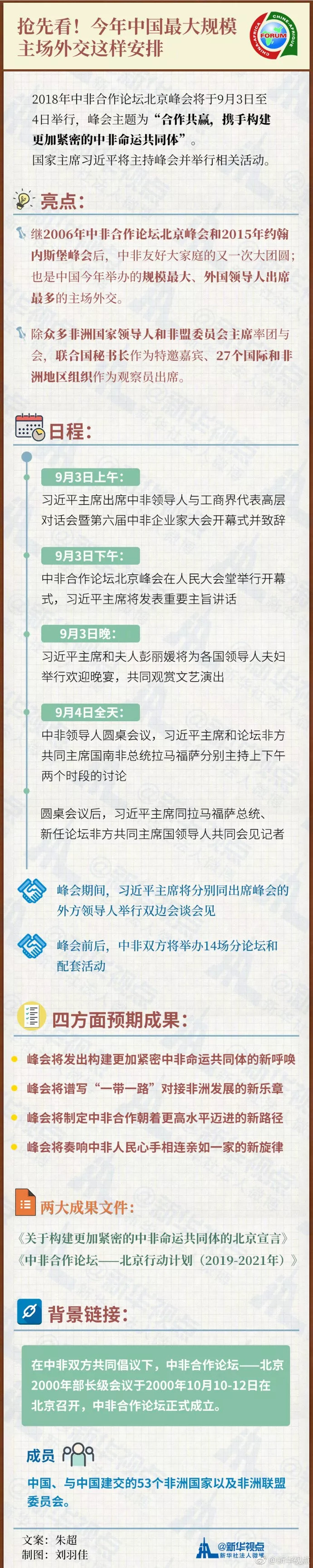 2018年中非合作论坛北京峰会将于9月3日至4日举行,作为今年中国规模最大、外国领导人出席最多的主场外交活动,会议日程如何安排?预计有哪些重要成果? 带你一图读懂↓↓↓