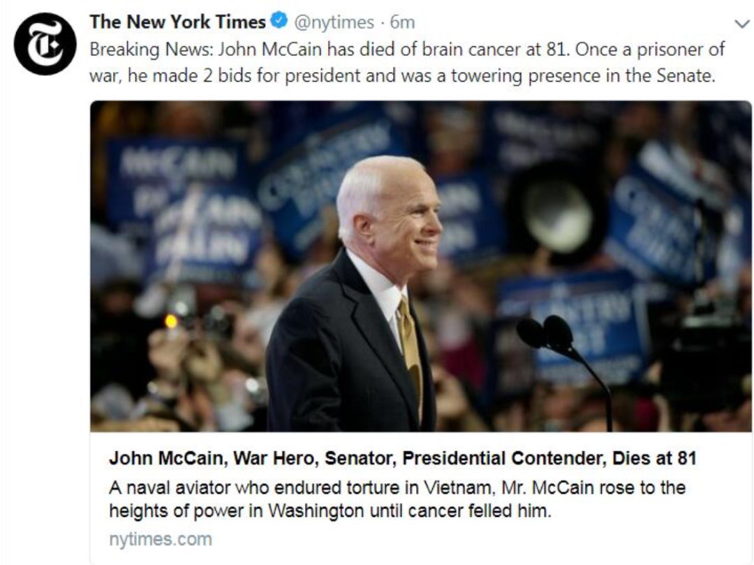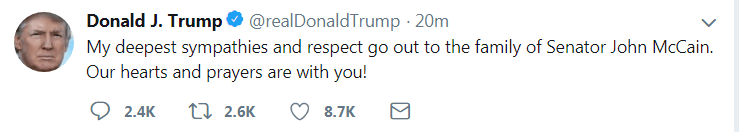 特朗普在推特上写道:“我向参议员约翰·麦凯恩的家人致以最深切的慰问和敬意。我们的心和祈祷与你们同在!”