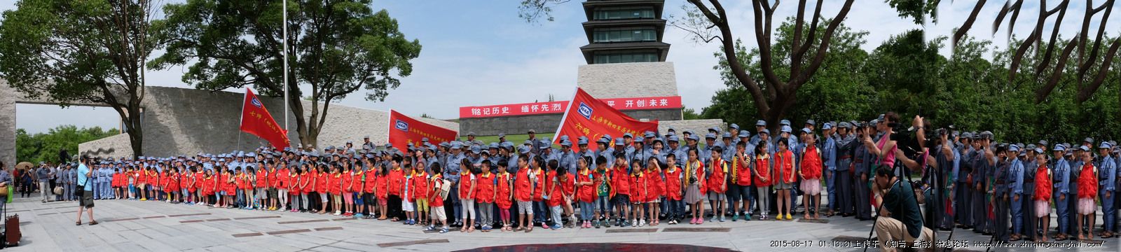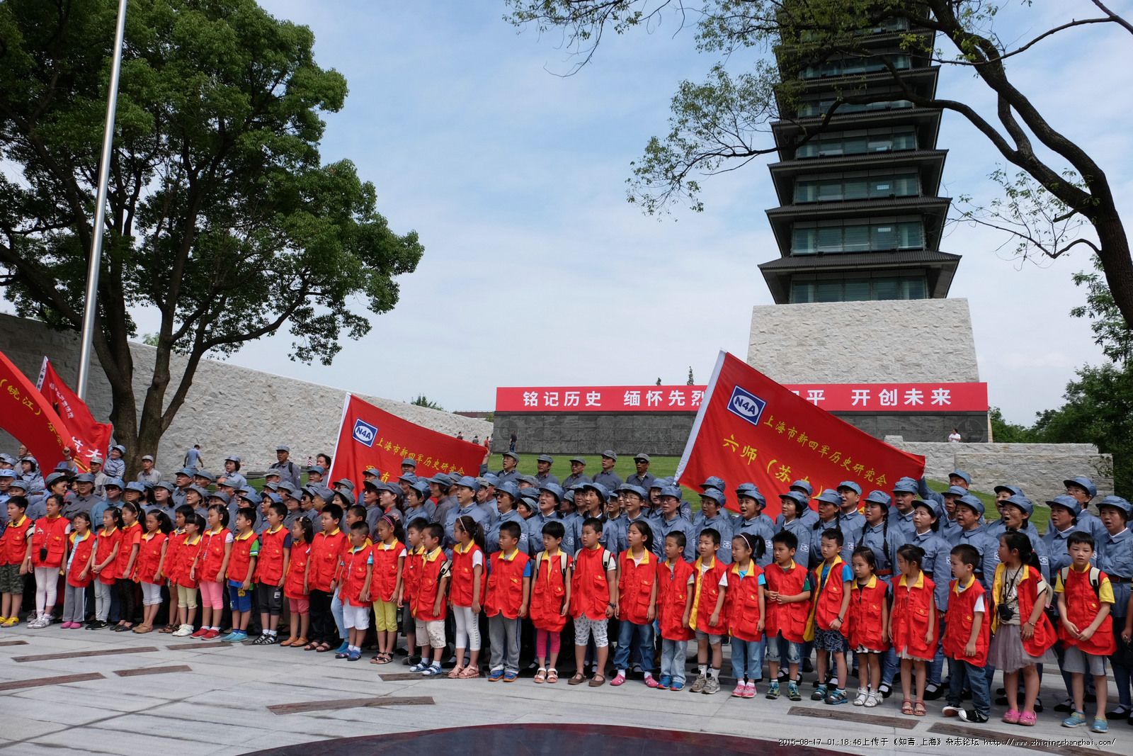 8月15日上午,新四军方阵和小主人报记者团的活动为第一批活动单位,在淞沪抗战纪念馆广场举行“纪念中国人民抗日战争暨世界反法西斯战争胜利70周年”歌咏活动。参加的有7支当年新四军、八路军子女后代组织的合唱团300多人及一百多名知青的第三代,小学二三年级《小主人报》的小记者孩子们.淞沪抗战纪念馆前广场上,集合着两支队伍:新四军团队,和小主人报小记者们,引吭高歌,歌声嘹亮,气势恢宏,从义勇军进行曲唱起,到新四军军歌,踏着先烈的足迹前进,团结就是力量,没有共产党就没有新中国,等多首当年抗战歌曲,通过洪亮的歌声,唱响中国最强音,使中华民族顶天立地、不屈不饶、顽强奋斗、一往无前的伟大精神。