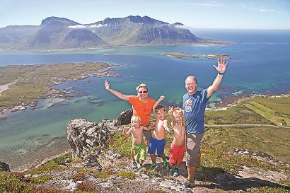 在挪威罗浮敦群岛,当地一家人在山顶合影留念。 CFP供图(资料照片)