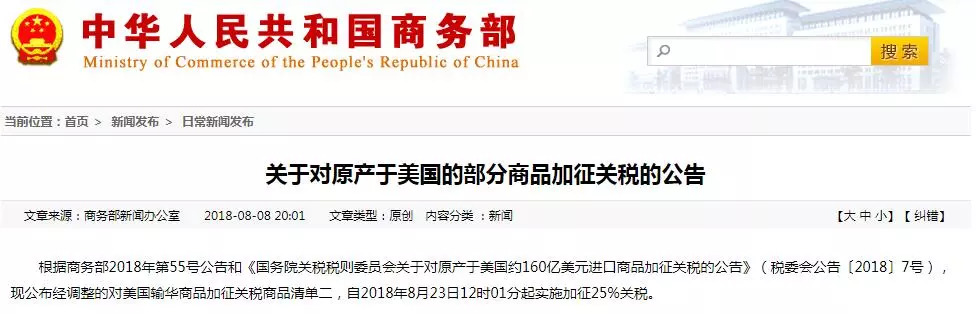 ▲商务部官网截图 报道称,美国的液化天然气企业将受到巨大冲击。切尼尔能源公司(Cheniere Energy)5月刚刚决定在美国时隔两年再次建设新的天然气设施。该公司与中国石油天然气集团签署了为期25年的长期合同,计划每年出口120万吨天然气。如果美国产天然气在中国失去价格竞争力,追加投资很可能成为企业的沉重负担。 而作为买方的中国也使出了浑身解数。以大豆为例,中国国内消费量的85%以上依赖进口,但是受贸易战影响,中国已开始采取措施。中国增加了可取代大豆粕的菜籽粕和葵花籽粕的进口,减少猪饲料中大豆粕的含量。最根本性的解决办法是通过增加大豆的种植面积来扩大国内生产。据悉,一系列对策将让2018年中国的大豆进口量比2017年减少1000万吨以上。