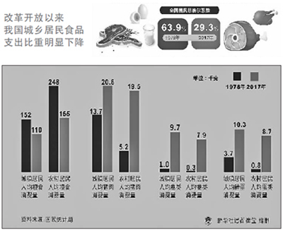 ![]() 改革开放以来我国城乡居民食品支出比重明显下降 1、消费品由短缺转向供应充裕 改革开放以来,随着计划经济体制下的流通格局被逐步打破和社会主义市场经济的不断发展,社会商品大为丰富,长期存在的短缺状态宣告结束,商品品种繁多、数量充足、质量档次明显提高。 反映消费品市场发展水平与规模的统计指标——社会消费品零售总额,由1978年的1559亿元增加到2017年的366262亿元,年均增长15%。 2017年,全国居民恩格尔系数(指食品支出总额占个人消费支出总额的比重)为29.3%,其中城镇、农村居民恩格尔系数分别为28.6%和31.2%,分别比1978年下降28.9和36.5个百分点。 吃、穿等基本生活类商品占社会消费品零售总额的比重明显降低。2017年,在限额以上单位商品销售类值中,粮油食品饮料烟酒、服装鞋帽针纺织用品类商品占比分别为14.6%和9.6%,分别比1978年食品、服装类商品零售额占社会消费品零售总额的比重降低37.2和12.4个百分点。 耐用品消费增长较快。2017年,我国城镇居民平均每百户年末彩色电视机、洗衣机和电冰箱拥有量分别为123.8、95.7和98台,而1981年,城镇居民平均每百户年末拥有彩色电视机、洗衣机和电冰箱的数量分别仅为0.6、6.3和0.2台。2017年,汽车类商品零售额为4.2万亿元,比1998年增长169倍,近20年来年均增长速度超过30%。 随着互联网特别是移动互联网的普及率逐年提高,以手机、计算机为代表的信息产品消费实现了从无到有、从零星到普遍的跨越式发展。2017年,城镇居民平均每百户年末拥有移动电话和计算机数量分别达到235部和81台,分别是2000年的12倍和8倍。 2、居民消费由实物型向服务型转变 随着人民生活水平的不断提高和市场供给端的长足进步,大众化消费增速加快,向多样性和个性化迈进,网络购物火爆。居民消费由实物型向服务型转变,文化娱乐、休闲旅游、大众餐饮、教育培训、医疗卫生、健康养生等服务性消费成为新的消费热点,体验类消费快速发展。 2017年,社会消费品零售总额中餐饮收入39644亿元,是1978年的723倍,年均增长18.4%,比社会消费品零售总额年均增速高3.4个百分点;餐饮收入占社会消费品零售总额比重由1978年的3.5%提升至2017年的10.8%。 周边游、短途游、亲子游、海岛游、邮轮游……旅游消费持续升温,居民出游方式多种多样。据国家旅游局数据显示,2017年,我国人均出游已达3.7次,国内旅游人数达到50亿人次,是1994年的10倍,年均增长10.3%。2017年全国旅游总花费约4.6万亿元,是1994年的45倍,年均增长18%。 在文化娱乐消费方面,据原国家新闻出版广电总局电影局发布的数据显示,2017年全国电影总票房559亿元,比1991年增长超过22倍,年均增长约12.9%;2012年以来我国电影市场规模稳居世界第二,2012年总票房为北美市场的25%,2017年已达到北美市场的77.6%。 3、消费对经济增长的拉动作用持续增强 随着消费市场持续较快增长,国内消费对经济增长的拉动作用持续增强,成为经济增长的第一驱动力,消费成为保持经济平稳运行的“稳定器”和“压舱石”。 最终消费支出对国内生产总值增长的贡献率由1978年的38.3%提升至2017年的58.8%,40年间提升20.5个百分点,成为国民经济增长的主要动力;资本形成总额对国内生产总值增长的贡献率由1978年的67.0%回落至2017年的32.1%,回落34.9个百分点。 改革开放以来,我国商品市场规模不断扩大,市场主体数量大幅增长,从业人员大量增加,对促进就业、提高人民群众收入起到积极作用。据第三次全国经济普查数据,2013年批发和零售业法人和个体经营户数超过1900万个,是1978年的18.4倍,年均增长8.7%;住宿和餐饮业法人和个体经营户数超过260万个,是1978年的22.3倍,年均增长9.3%。 批发和零售业、住宿和餐饮业逐渐成为吸纳城镇就业和承接农村劳动力转移的主力军。2016年国有单位、城镇集体单位、私营单位和个体经营户中批发和零售业年末从业人员超过1.2亿人,比1978年零售商业机构的全部从业人数增长超过26倍,年均增长约9.1%。 (责任编辑:日升) |