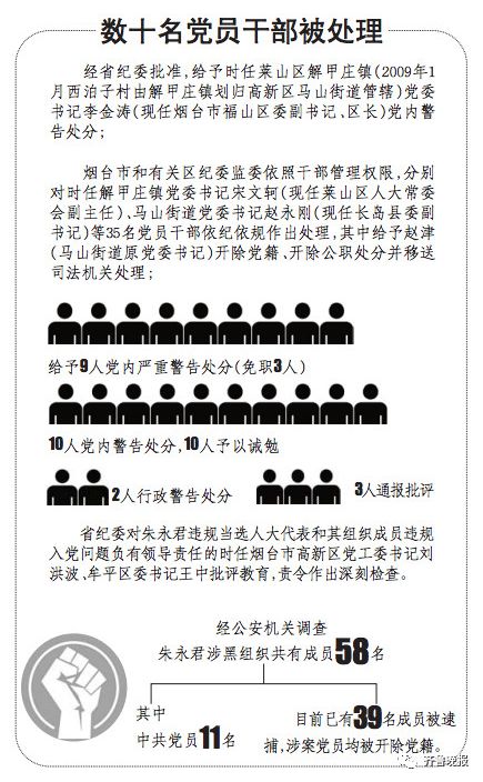 “由黑染红、以红护黑” 七名成员担任村支书 朱永君,男,1970年10月生,2008年12月加入中国共产党,2010年7月至2017年12月任西泊子村党支部书记、村委会主任。朱永君涉黑组织涉嫌组织领导参加黑社会性质组织罪、寻衅滋事罪等12个罪名,共作案49起,造成2人重伤,11人轻伤,20余人轻微伤,财产损失600余万元。 根据通报,该涉黑组织长期进行违法犯罪活动,“以黑护商、以商养黑”。自20世纪90年代开始,朱永君就网罗社会有前科劣迹人员,逞强斗狠、肆意滋事、抢占地盘,牢牢控制当地海产养殖品购销市场;为攫取巨额利润,先后成立多家公司,涉足多个行业,通过威胁、恐吓、暴力、假借合同纠纷、强迫交易等手段,控制资源、垄断市场。 此外,该组织还有计划地把持基层政权,“由黑染红、以红护黑”。朱永君想方设法获取“政治光环”、攫取政治荣誉、把持基层政权。2007年3月,朱永君借回村协助处理村务之机,在劳教期间主动申请入党;同年11月,当选村委会主任;2008年12月成为预备党员;2010年7月,马山街道党委任命朱永君为村党支部书记;2011年、2014年村级组织换届中,两次当选村党支部书记、村委会主任。 同时,朱永君通过安排饭局、请客送礼、威逼利诱等方式,极力扶植其他组织成员选举村干部、加入党组织,企图把持更多基层政权。至案发时,该组织共有7人担任过村党支部书记(6人兼任村委会主任),1人担任过村党支部副书记,1人担任过村委会委员;2014年11月至2017年10月,有6人同期担任村党支部书记(5人兼任村委会主任),把持6个村级政权。 基层党组织和有关部门党员干部为该涉黑组织提供“软保护”。比如,2006年下半年,时任解甲庄镇党委书记李金涛考虑到西泊子村信访问题突出,召开会议决定让劳教期间的朱永君回村协助工作,后经时任党委副书记、镇长宋文轲协调有关机关,朱永君回村协助村务。据统计,朱永君在一年零五个月的劳动教养期内,共4次请假40余天、8次减期5个多月,提前解除劳动教养。 该案涉及党员干部多 严重破坏基层政治生态 朱永君案是一起涉黑涉恶腐败和“保护伞”典型案件。从原因上分析,首先是基层党组织管党治党意识薄弱、责任缺失。朱永君案暴露出少数基层党组织全面从严治党责任和压力传导不到位,个别党员领导干部管党治党严重失职失责。比如,2007年6月,时任解甲庄镇党委书记宋文轲在明知朱永君正被劳教、不具备发展党员条件的情况下,仍召开会议提议发展朱永君为入党积极分子,其他人员均没有提出反对意见,主体责任严重缺失。 基层组织职责弱化,职能部门监管失位。比如,在朱永君本人及10名组织成员入党、担任村干部过程中,相关镇街党组织和上级组织部门,均存在违反党员发展程序、对入党材料审查把关不严等问题。 基层党员干部纪法意识淡薄,甚至与黑恶势力沆瀣一气。从朱永君案看,劣迹斑斑的前科人员,能够顺利当选村干部,除了党组织和职能部门失职失察外,也一定程度上反映出有的基层党员和群众政治素质不高,纪法意识不强。