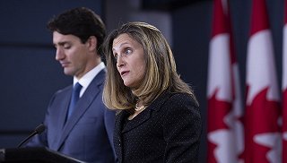 2018年10月1日,加拿大渥太华,加拿大总理特鲁多宣布美国与墨西哥、加拿大已达成新的贸易协定。图为特鲁多与加拿大外长弗里兰在一场新闻发布会上。图片来源:视觉中国