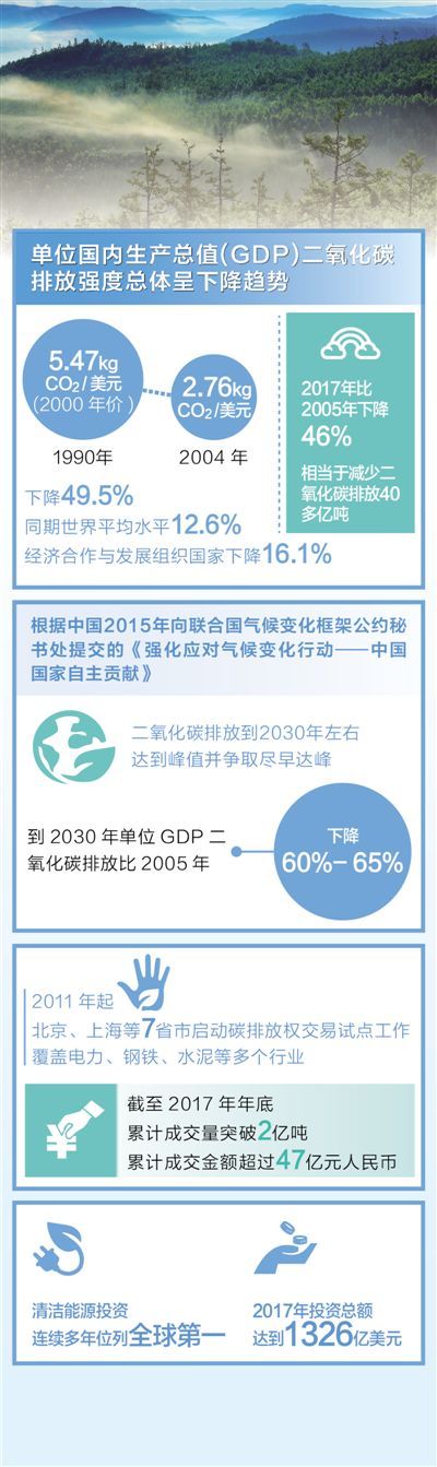 《中国应对气候变化国家方案》 《中国应对气候变化的政策与行动2017年度报告》 制图:沈亦伶 积极应对气候变化,是中国实现可持续发展的内在要求,也是深度参与全球治理、打造人类命运共同体,推动全人类共同发展的责任担当。 自1992年联合国环境与发展大会后,中国政府率先组织制定了《中国21世纪议程——中国21世纪人口、环境与发展白皮书》,并从国情出发采取了一系列政策措施,为减缓全球气候变化做出积极贡献。 党的十八大以来,我国加快推进生态文明顶层设计和制度体系建设,大力推动绿色发展,发布《中国落实2030年可持续发展议程国别方案》,实施《国家应对气候变化规划(2014—2020年)》,推动生态环境保护。 在经济社会稳步发展的同时,中国单位国内生产总值(GDP)二氧化碳排放强度总体呈下降趋势。根据国际能源机构的统计数据,1990年中国单位GDP化石燃料燃烧二氧化碳排放强度为5.47kgCO2/美元(2000年价),2004年下降为2.76kgCO2/美元,下降了49.5%,而同期世界平均水平只下降了12.6%,经济合作与发展组织国家下降了16.1%。 “十二五”时期,我国单位GDP二氧化碳排放量累计下降20%左右,超额完成先前确定的17%的目标。根据“十三五”规划纲要,我国要在“十三五”期间实现单位GDP二氧化碳排放量累计下降18%这一约束性指标。而2017年,我国单位GDP二氧化碳排放比2005年下降了46%,相当于减少二氧化碳排放40多亿吨,已经超过对外承诺的到2020年碳强度下降40%—45%的上限目标。 为进一步推动绿色发展,2017年年底,我国印发了《全国碳排放权交易市场建设方案(发电行业)》,标志着全国碳排放交易体系正式启动。作为环境保护的倡导者,中国在全球应对气候变化领域的领导作用十分突出,中国在全球气候治理中的“领跑”作用广受赞誉。 美国芝加哥大学能源政策研究所今年3月发表的报告称,2013年至2017年间,中国空气中细颗粒物水平平均下降32%。报告称赞短短4年间,中国治理空气污染取得的进步“不管从哪种标准说都相当卓越”,而美国完成同样的任务用了数十年。 在推进生态文明建设过程中,中国创造了很多机遇和经济增长点,提供了很多新的思路,有助于各国在世界范围内应对气候变化。中国长期致力于引导应对气候变化国际合作,努力成为全球生态文明建设的重要参与者、贡献者和引领者。除了积极参与气候变化谈判,以大国外交和多边合作方式推动《巴黎协定》达成,并积极引导推进《巴黎协定》后续谈判进程,中国还通过切实行动推动和引导建立公平合理、合作共赢的全球气候治理体系,推动构建人类命运共同体。 过去十多年的实践证明,中国正在探索出一条应对气候变化、保护环境与实现经济增长多赢的发展路径。我国还将团结其他国家,加强南南合作,并与国际组织、多边金融机构等加强合作,凝聚共识、落实行动、合作共赢,为应对全球气候变化贡献“中国方案”。 (责任编辑:日升) |