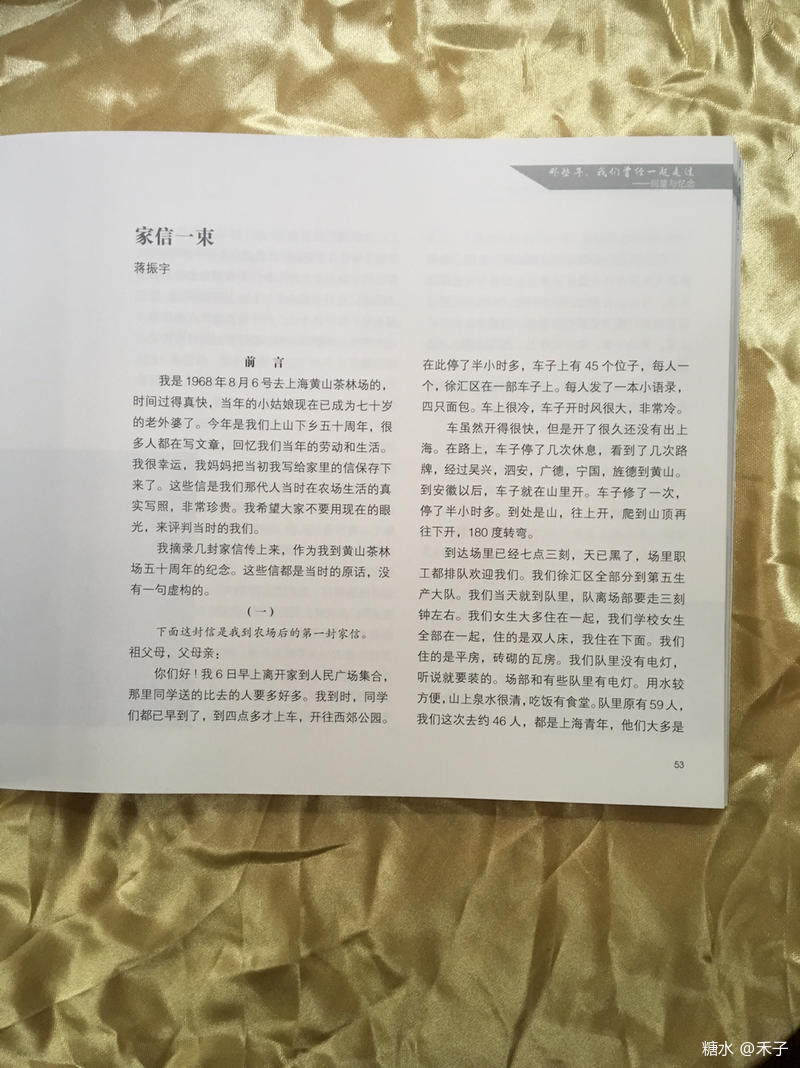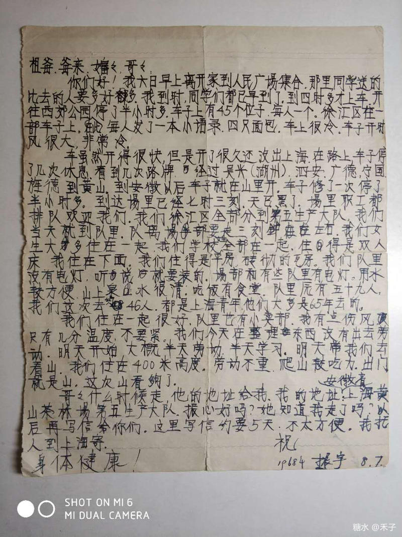 ![]() 近日收到好友丁海赠阅的黄山5连老三届知青回忆文集《南山往事》,其中有66届上海五十一中学高中毕业生、50年前上山下乡赴黄山茶林场的知青蒋振宇“家信一束”的文章。家信共有6件,从1968年8月7日(到场第二天)至1972年7月21日。这些家信经振宇母亲保存,后由振宇收藏至今,原件尚在,弥足珍贵。家信原汁原味,能折射出一段历史。经振宇大力协助,特制成格图,分享给大家。 ![]() 我是1968年8月6号去上海黄山茶林场的,时间过得真快,当年的小姑娘现在已成为七十岁的老外婆了。今年是我们上山下乡五十周年,很多人都在写文章,回忆我们当年的劳动和生活。我很幸运,我妈妈把当初我写给家里的信保存下来了。这些信是我们那代人当时在农场生活的真实写照,非常珍贵。我希望大家不要用现在的眼光,来评判当时的我们。 我摘录几封家信传上来,作为我到黄山茶林场五十周年的纪念。这些信都是当时的原话,没有一句虚构的。 下面这封信是我到农场后的第一封家信。 ![]() 祖父母,父母亲: 你们好!我六日早上离开家到人民广场集合,那里同学送的比去的人要多好多。我到时,同学们都已早到了,到四点多才上车,开往西郊公园。在此停了半小时多,车子上有45个位子,每人一个,徐汇区在一部车子上。每人发了一本小语录,四只面包。车上很冷,车子开时风很大,非常冷。 车虽然开得很快,但是开了很久还没有出上海。在路上,车子停了几次休息,看到了几次路牌,经过吴兴,泗安,广德,宁国,旌德到黄山。到安徽以后,车子就在山里开。车子修了一次,停了半小时多。到处是山,往上开,爬到山顶再往下开,180度转弯。 到达场里已经七点三刻,天已黑了,场里职工都排队欢迎我们。我们徐汇区全部分到第五生产大队。我们当天就到队里,队离场部要走三刻钟左右。我们女生大多住在一起,我们学校女生全部在一起,住的是双人床,我住在下面。我们住的是平房,砖砌的瓦房。我们队里没有电灯,听说就要装的。场部和有些队里有电灯。用水较方便,山上泉水很清,吃饭有食堂。队里原有59人,我们这次去约46人,都是上海青年,他们大多是65年去的。 我们住在一起很好,队里也有小卖部。我有点伤风,只有几分温度不要紧。我们今天在整理东西,没有出去劳动。明天开始,大概半天劳动半天学习。明天带我们去看山,我们住在400米高度,劳动不重,爬山较吃力。出门就是山,这次山看够了。 我们的作息制度是:五点半起床,六点钟学习,七点钟吃早饭,七点半到十一点出工。十二点到三点半休息,三点半到六点半出工。 以后再写信给你们,这里写信约要5天,不太方便。我托人到上海寄。 ……………… 祝 身体健康! 振宇 上 68.8.7 ![]() 家 信 (二) 祖父母.父母亲: 你们好!我们在11月1日从山上下来后,劳动了一个多星期,在11日到山上砍茅草搭草房。原先已有五个人上去搭房子,9日男生全部上去,(因为只盖好一间房子。)山上茅草很少,盖一间草房,住15个人。一个屋顶就要几千斤草,加上周围还用草围起来,草就更加显得需要了。已经盖了十几天了,只盖好一间。我们在11日早上,上山帮助砍草,当天再赶回队里。12日我们就带了铺盖上去,又砍了一天草。晚上新房落成,我们搬了进去。我们用石头垒到像床那么高,再铺上竹头,就像睡在床上一样,我现在就坐在床上给你们写信。 新造的草房不免有些透风,下雨可能要漏,但这是我们自己照的啊!山里竹子石头多,造房子可是比较容易的。我们现在住的地方离队里较近,上山一个多小时,下山四十分钟即可,我们准备星期六下去。我们在这里主要是管理衫木林,把树木之间的草砍掉。一共有400多亩,每人一天要砍5分地,30个人大概要两个月左右。如果下雪就要提早下去,可能一个月后就要下雪。本来衫木林是叫民工管理的,现在民工一律不可以请,因此要自己管理。山上天气比下面冷,早上起来要穿球裤了,脚特别冷。前几天。冷风影响我们场,在山下就很冷,那天出工,穿了棉毛裤,球衫上山,还是很冷。劳动时,手都冻僵了,和冬天一样,山上就更能冷了,已经结冰了。山里天气就是这样,早晚冷,中午热,衣服一套套换。我们现在8点到11点半劳动,12点半到4点半劳动,晚上收工早。以后日短夜长,劳动时间更少了。我们队里由于刮经济主义风回去的人多,留下的人只有50多人,因此许多工作都没有做好。砍草带,茶叶管理都等着我们去做。其他队都已准备过冬,每天背柴,我们现在柴也没有储存多少。等我们管理好衫木林下来,已是冬天了。每天劳动就是背柴,一下雪,一个多星期不出门。这里和上海郊区比,劳动不重,主要是爬山累些,冬天上郊还要积肥,修提,开荒等等。这里最忙是采茶叶,四,五月份最忙,下雨也要出工。因为一天茶叶不采就要长老了,要采的快。 这里有卖棉花毯,八斤重,6.65元,但是很硬,是黑的质量不好,大家都没有去买。太平是一个较大的镇,有些人已去玩过,乘车来回0.9元,(要走一个多小时才可乘车)太平土产很多,瓜子,绿豆不要粮票,0.3元一斤,要粮票的,只要0.14元,花生0.4元一斤。芝麻花生都是油料作物,不好多买,只是到农民家里去买。我想到太平去一次, 买点花生,如有芝麻也买点,不知是否要买绿豆。这里供销社有黄豆,蚕豆,赤豆都可以买,我想今年过年回来是否要买点带回来。 ……… 哥哥什么时候可以回来?我托别人下山去寄,就此搁笔。 祝 身体健康! 振宇 