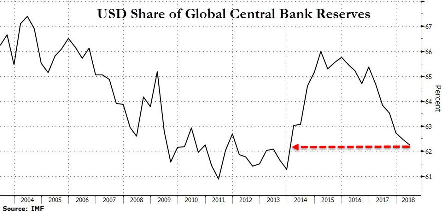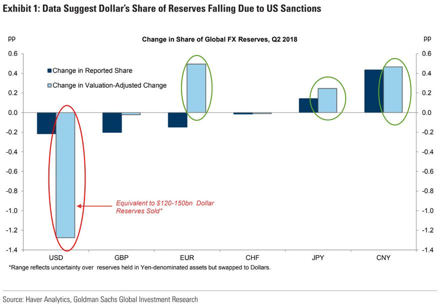 美元储备地位下滑,欧元、日元及人民币地位明显提升。高盛认为,美国扩大对俄制裁,导致后者抛掉包括全部美债在内的大部分美元资产,是这背后的主因,未来如果其他国家仿效,那么这一趋势还将延续。 俄罗斯“清仓式”甩卖美国国债,中国与日本也在抛售。这一切,都在不断推低美元的国际储备地位。 ![]() ![]() ![]() 美国财政部周二公布的国际资本流动(TIC)报告显示,8月中国所持美债规模环比减少59亿美元至1.1651万亿美元,为连续第三个月减持;日本8月持仓环比减少56亿美元至1.0299万亿美元,创2011年10月以来新低。 俄罗斯的身影则从TIC报告中彻底消失,这是因为从今年4月起,俄罗斯已不再被列入TIC的美债主要海外持有者名单。今年4月,俄罗斯的美债持仓环比剧减50%,5月降幅又至少接近40%。 在这种背景下,美元资产在全球央行资产储备中的占比,也延续近年来的持续下滑的态势。IMF数据显示,美元在全球央行外储中的占比已经降至62.3%,创2013年来新低。而与此同时,欧元、日元以及人民币资产在全球央行外储中的占比则明显提升。 高盛全球汇率及新兴市场策略联合负责人Zach Pandl在周一发布的报告中认为,近期美元在央行外储中占比下滑的最主要推手,正是美国裁所导致的俄罗斯对美债的大举抛售。 今年4月初,美国以干预2016年大选为由,扩大对俄罗斯的制裁,新加入制裁名单的包括7名俄罗斯富豪、12家公司以及17名政府官员。 在那之后,俄罗斯便“清仓式”减持美债,Pandl称,在俄罗斯央行将所持1500亿的美元资产中,4-6月减持的幅度达到约850亿美元。他称: 在二季度,俄罗斯央行可能卖掉了所持有的大部分美元资产,这其中可能包括由美国托管机构持有的全部美债,并将资产转投到欧元以及人民币债券上。 这在当季美元在储备资产中所占份额下滑的因素中,占据超过一半。 Pandl表示,美国制裁带来的风险是导致美元储备地位下滑的主要因素,未来如果其他央行仿效俄罗斯央行作出类似举动,美元在国际储备资产中的占比还会进一步下滑。 金融博客Zero Hedge则暗示,从历史上看,葡萄牙、西班牙、荷兰等国的货币都曾经是储备货币,虽然目前的储备货币是美元,但“无事恒久远”。 *本文来自华尔街见闻(微信ID:wallstreetcn)。开通华尔街见闻金卡会员,即刻获取金融市场体系化服务。* (责任编辑:晓歌) |