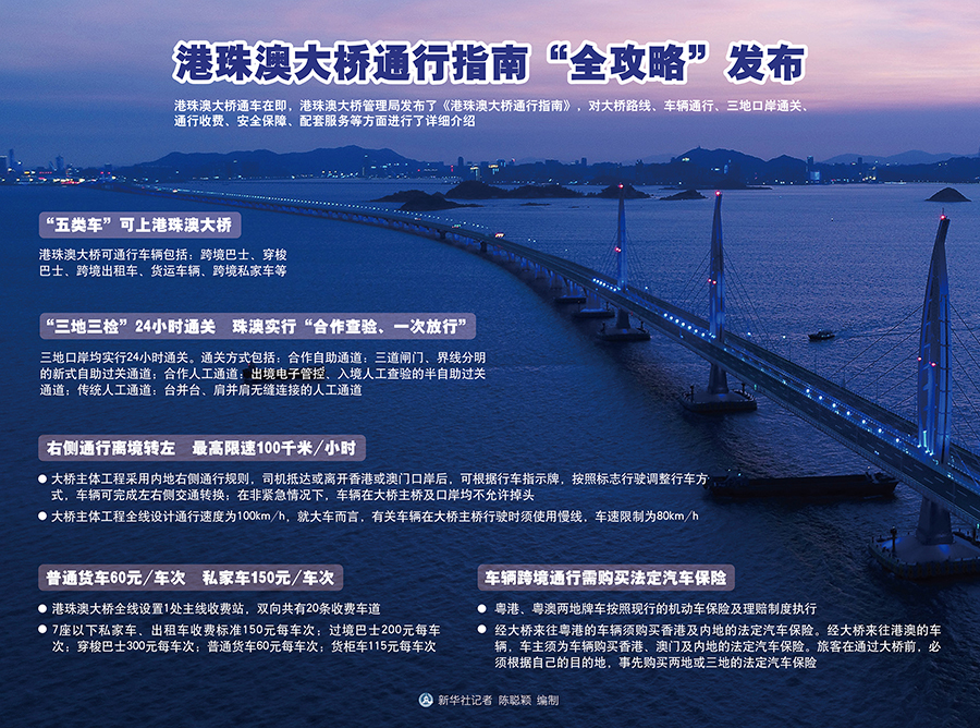 这是港珠澳大桥收费广场(10月20日无人机拍摄)。 新华社记者吴鲁摄 港珠澳大桥通车在即,港珠澳大桥管理局发布了《港珠澳大桥通行指南》,对大桥路线、车辆通行、三地口岸通关、通行收费、安全保障、配套服务等方面进行了详细介绍。 “五类车”可上港珠澳大桥 港珠澳大桥可通行车辆包括:跨境巴士、穿梭巴士、跨境出租车、货运车辆、跨境私家车等。 ——跨境巴士:大桥开通首年安排粤港、港澳跨境巴士配额共200个,其中粤港150个(供粤港合资公司)、港澳50个(34个为香港配额,16个为澳门配额),已全数发放(注:珠澳口岸间不通客车)。另有200个配额给现时行走其他口岸的粤港跨境巴士转走大桥。每一配额可于每日营运来回班次各一次。跨境巴士在大桥口岸区域内不允许接载新的旅客。 ——穿梭巴士:口岸穿梭巴士为大桥粤港及港澳口岸之间的主要交通工具,提供频密接驳服务。繁忙时间为每5分钟一班,非繁忙时间为每10—15分钟一班,深夜时段为每15—30分钟一班。口岸穿梭巴士不受配额限制。 ——跨境出租车:大桥开通首3年安排粤港、港澳跨境出租车配额共250个。其中,粤港配额150个,港澳配额100个。每一配额可营运一辆跨境出租车,每日往来接送次数不限。 ——货运车辆:在粤港跨境货车方面,现时粤港跨境货车可以免办手续通过港珠澳大桥(但不包括往来福田保税区的货车)。大桥开放初期,暂不增加粤港跨境货车指标;在港澳跨境货车方面,现时港澳特区政府仍在就跨境货车的细节安排进行讨论。 ——跨境私家车:在粤港私家车方面,在大桥开通前发出的香港两地牌私家车及内地私家车配额分别为约10000个和约1000个。此外,粤港政府也会在稍后适当时间宣布允许目前持有配额使用其他口岸的粤港两地牌跨境私家车,免手续试用大桥的细节安排。 在港澳跨境私家车方面,香港及澳门跨境私家车配额分别为300个(有效期为三年)及600个(有效期为一年),持配额的私家车可于有效期内多次进出港澳市区。此外,符合资格的香港私家车车主可通过“港珠澳大桥澳门口岸泊车转乘计划”,驾驶香港私家车前往澳门口岸边检大楼东停车场停泊(东停车场预设有3000个供跨境私家车预约的泊车位),然后在澳门边检大楼办理入境手续后,于澳门口岸转乘其他交通工具前往澳门市区。“港珠澳大桥澳门口岸泊车转乘计划”不设配额。